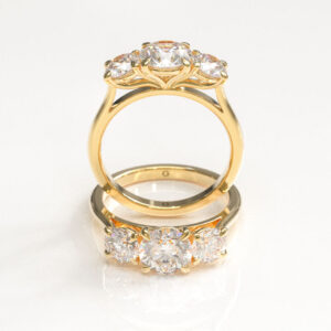 Our Round Cut Trilogy Engagement Ring features three brilliant round stones representing your past, present, and future. Expertly crafted for maximum sparkle, this elegant design offers classic beauty with meaningful charm.