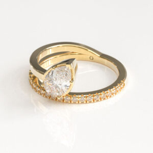 Alexandra is a contemporary design featuring an Oval cut center diamond set in sharp cat claws for an edgy yet refined finish. The band is accented with a striking layout of small pear-shaped diamonds. The pears create a modern sculptural silhouette that is fresh and effortlessly stylish.