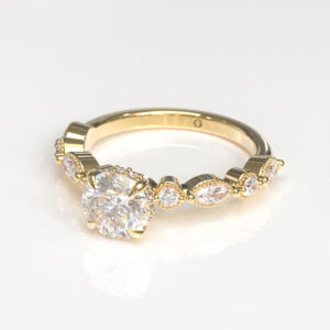 Charlotte is the perfect embodiment of romance and graceful feminity. At its heart lies a dazzling round brilliant center stone framed by a delicate milgrain band adorned with alternating marquise cut and small round diamonds. The detailed arrangement creates a vintage lace-like effect that sparkles from every angle.