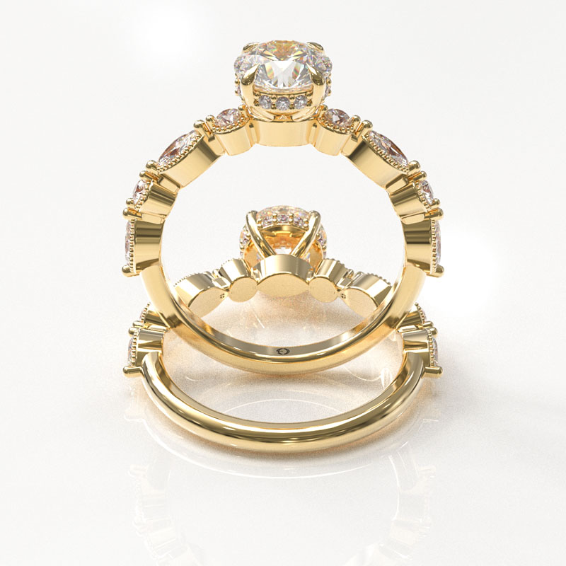 Charlotte is the perfect embodiment of romance and graceful feminity. At its heart lies a dazzling round brilliant center stone framed by a delicate milgrain band adorned with alternating marquise cut and small round diamonds. The detailed arrangement creates a vintage lace-like effect that sparkles from every angle.