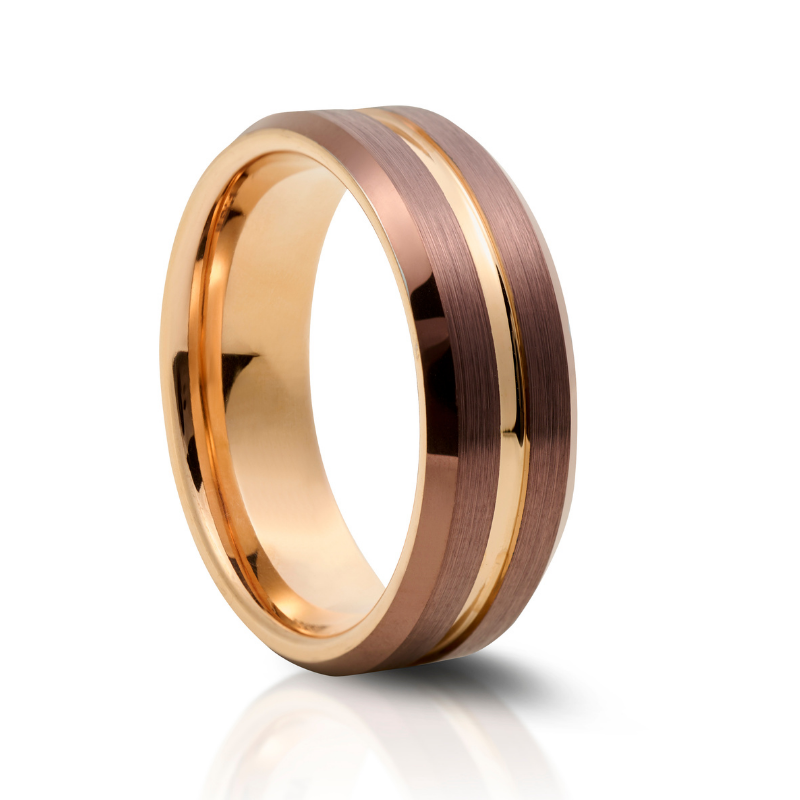 Our Coffee and Rose Gold Tungsten Ring offers a luxurious brown brushed metal finish, lined with a Rose Gold groove and inner. Made for comfort and style, this Ring offers its wearer a truly unique look!