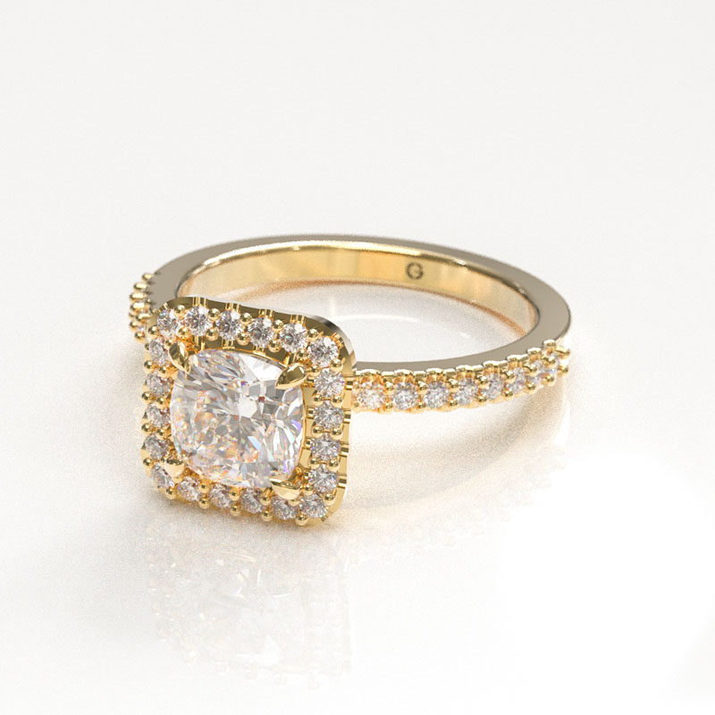 Our Cushion Cut Halo Ring showcases a radiant cushion-shaped center stone, elegantly set in a delicate four-claw setting. A fine micro pavé halo surrounds the center, adding extra sparkle, while the slender micro pavé band completes the look with timeless sophistication