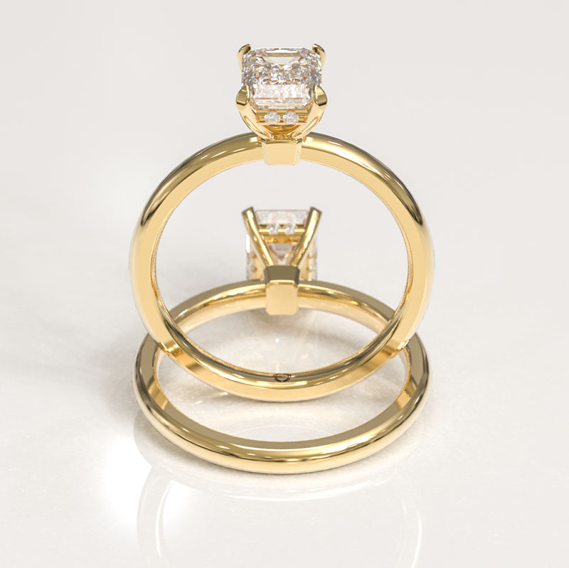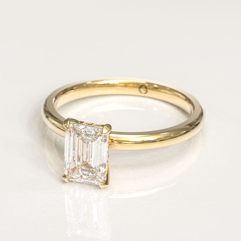 Our Four Claw Emerald Cut Engagement Ring has a beautiful radiant cut center stone set in four round claws on a simple band in the metal of your choice featuring a hidden halo.
