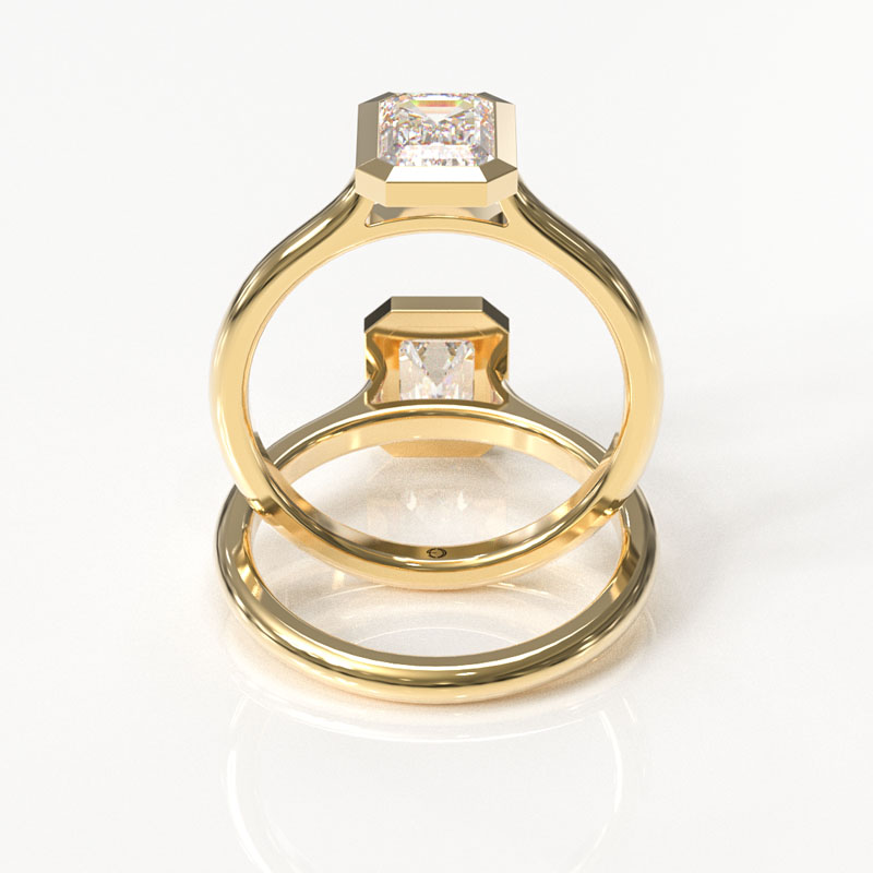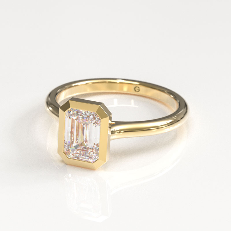 Kate features a striking emerald-cut center stone set in a sleek bezel setting that highlights the diamond’s clean lines. This solitaire design blends contemporary sophistication with vintage allure. Perfect for those who appreciate understated luxury with a strong, modern edge.