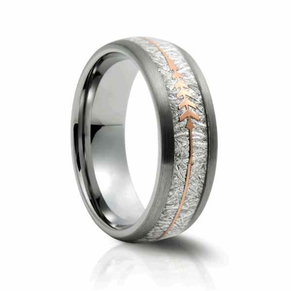 This Meteorite and Arrow Design Tungsten Ring features Rose Gold arrow accents along the outside of the band. Arrows symbolise moving forward in life and never looking back – a sentimental gesture for starting your lives together.