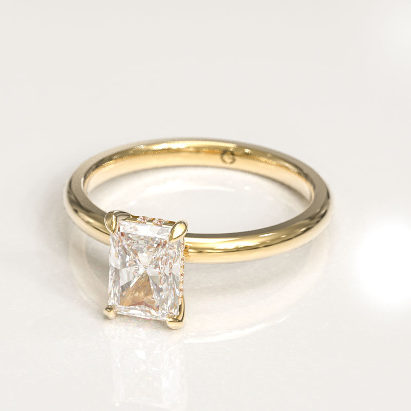 Our Four Claw Radiant Cut Engagement Ring has a beautiful radiant cut center stone set in four round claws on a simple band in the metal of your choice featuring a hidden halo.
