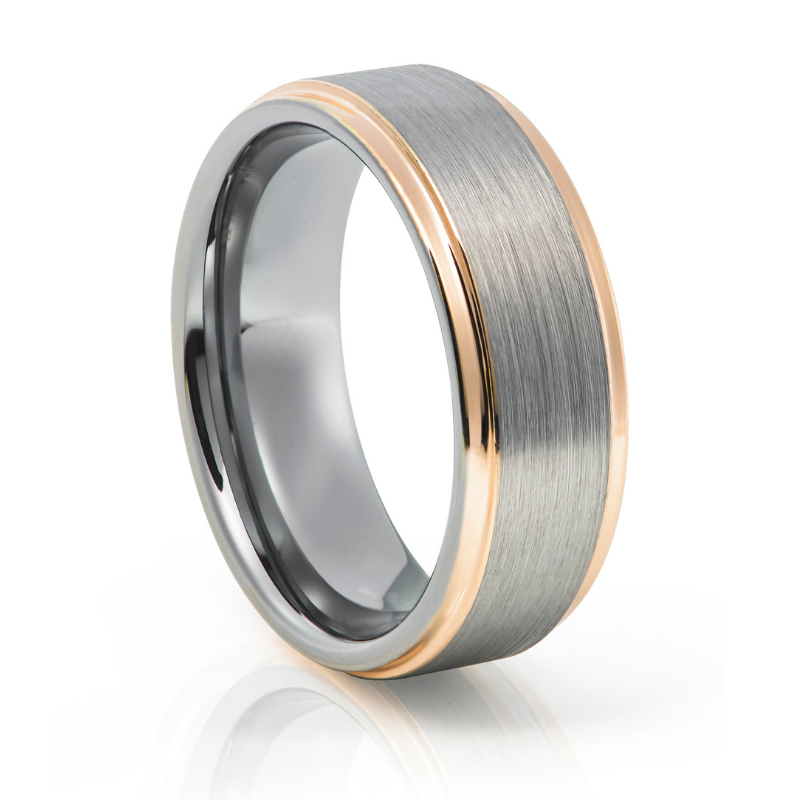 Handsome tungsten band with rose grooved edges and ashen matt centre finish