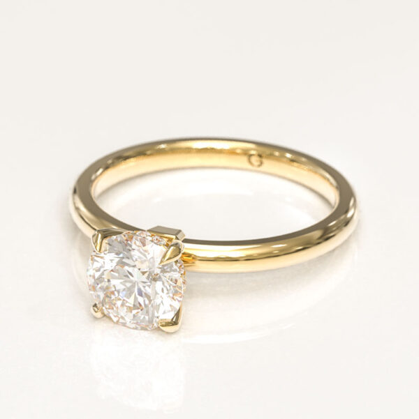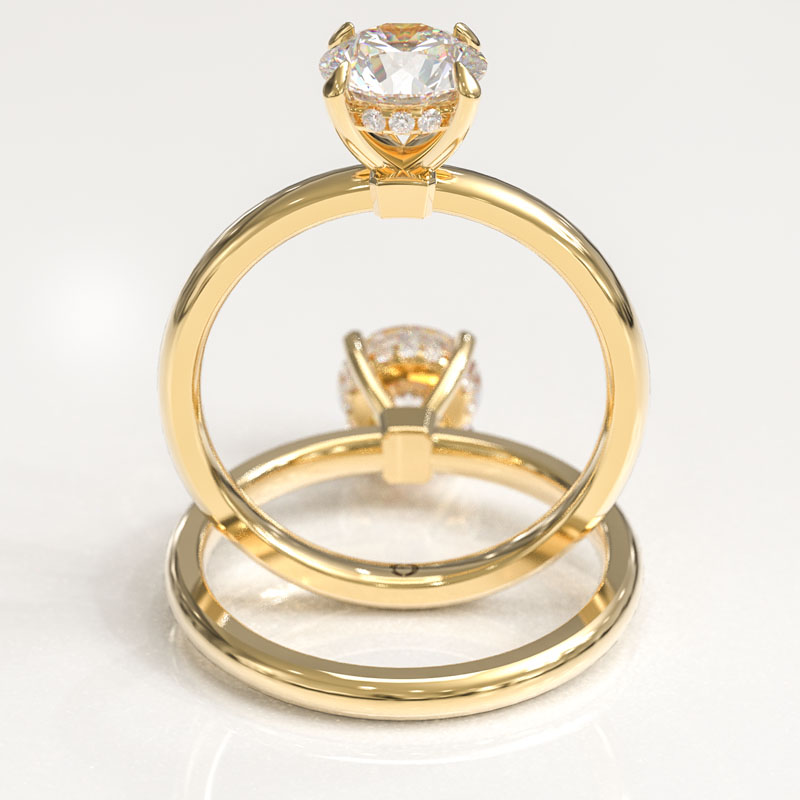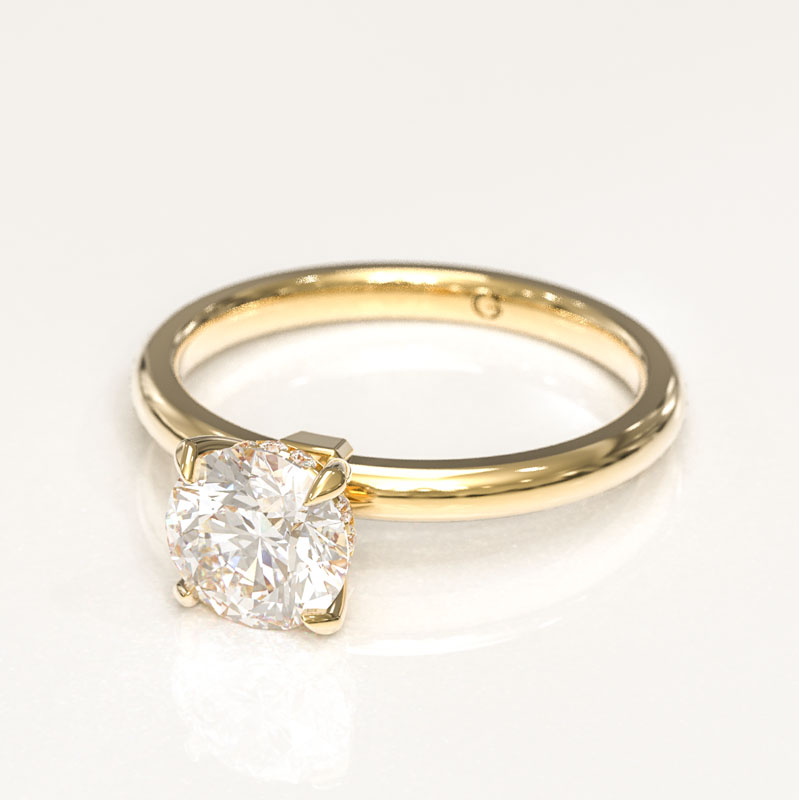Our Four Claw Round Cut Engagement Ring features a brilliant round center stone securely set in classic four claws, accented by a shimmering hidden halo. Finished with a sleek, minimal band crafted in the metal of your choice, this design perfectly balances simplicity with sparkle.