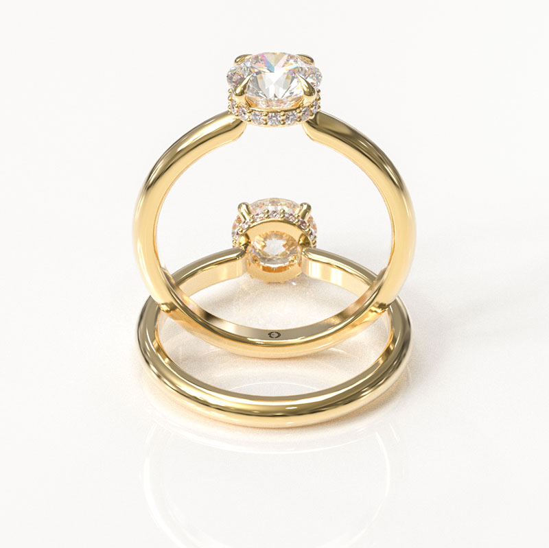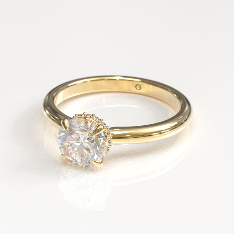 Venice features a refined round cut solitaire elevated with a hidden halo of sparkling diamonds beneath the setting. This elegant design offers a classic look with a modern hidden twist. Available in white, yellow, or rose gold. Timeless beauty from every angle.