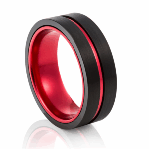 Refined tungsten traditional band with scarlet centre groove with matt black sides and red inner band